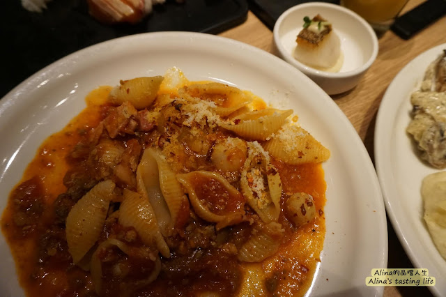 紅醬義大利麵,仔細看還有加小貝柱喔~