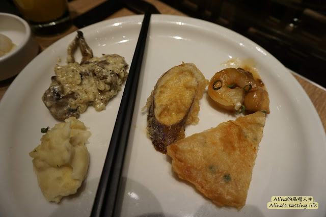 這盤有薯泥、奶油菇菇燴飯、炸茄子、晶瑩剔透的蝦仁豆腐、月亮蝦餅