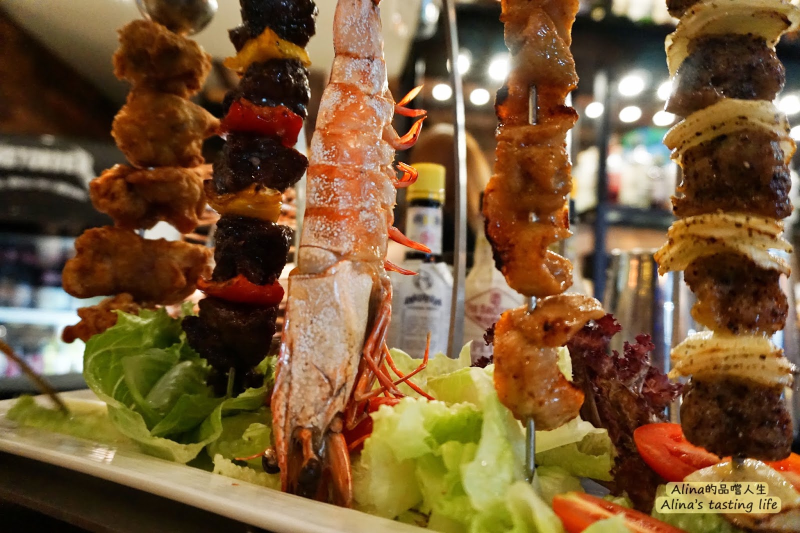 我對這五串的排序:右1羊肉>左2牛肉>大蝦>右2松阪豬肉>左1炸雞肉