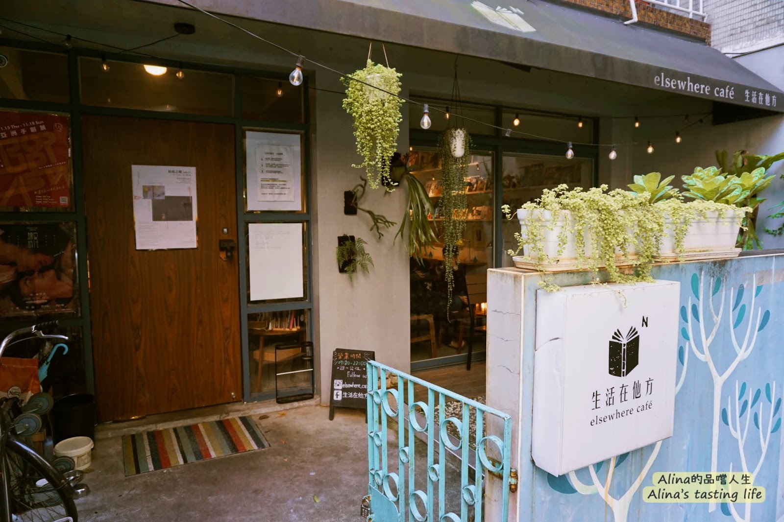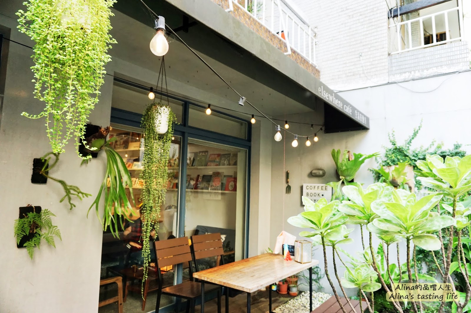 有室外的座位區,黃色的燈泡與綠色植物的搭配很舒服、自然!