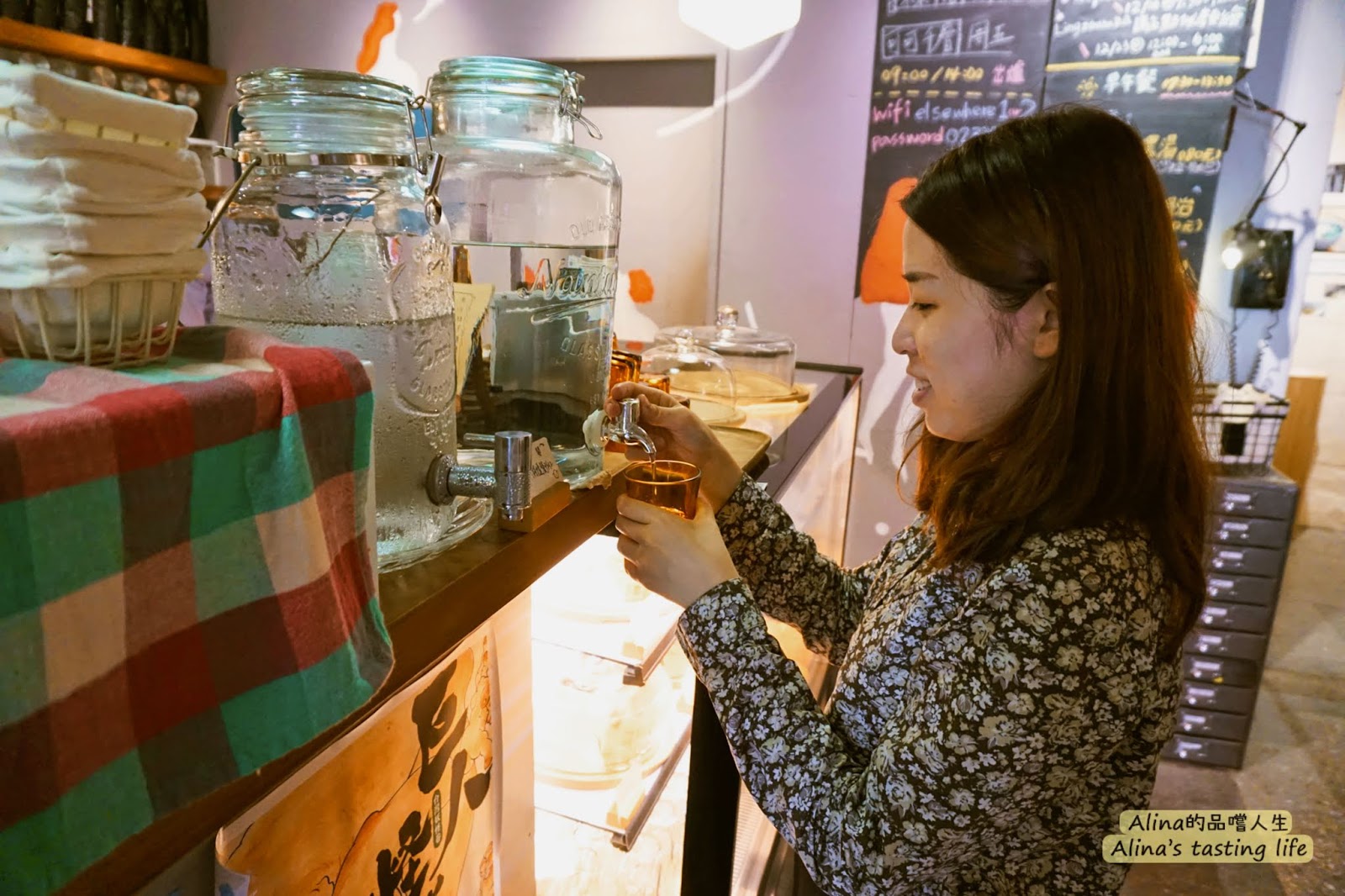 水的話就是自己去裝,這種玻璃大瓶子裝水真是文青升等囉~缺點就是水龍頭超瘦小,裝一小小杯水要等很久啊,這就是享受文青的效率嗎