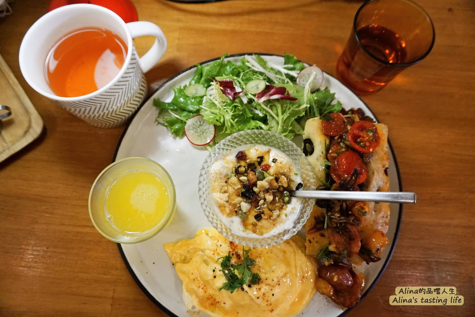 除了那小碟燉菜還有蛋料理、堅果優格、沙拉、小杯果汁、佛卡夏