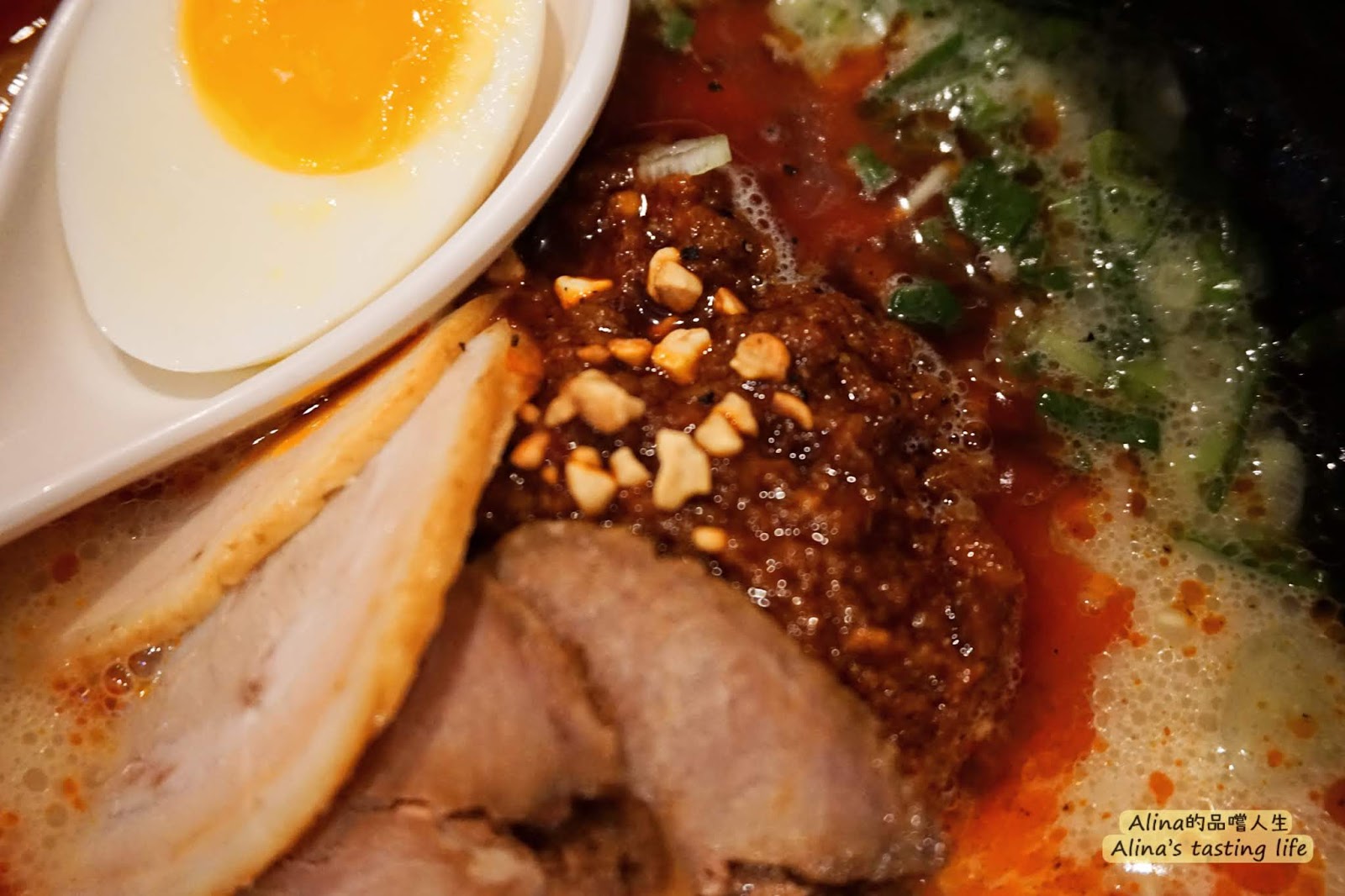特製辣肉味噌就是中間多了一個辣醬肉,辣肉味噌一上桌就香噴噴逼人,而且特製的版本份量更多,肉片就有兩款共四片,還多了半顆溏心蛋