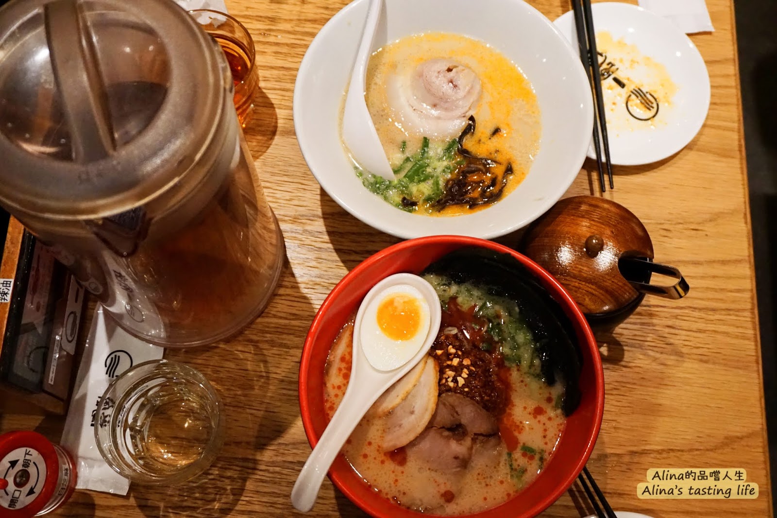 拉麵店均會有的醬料、餐具組,旁邊還有芝麻可以磨